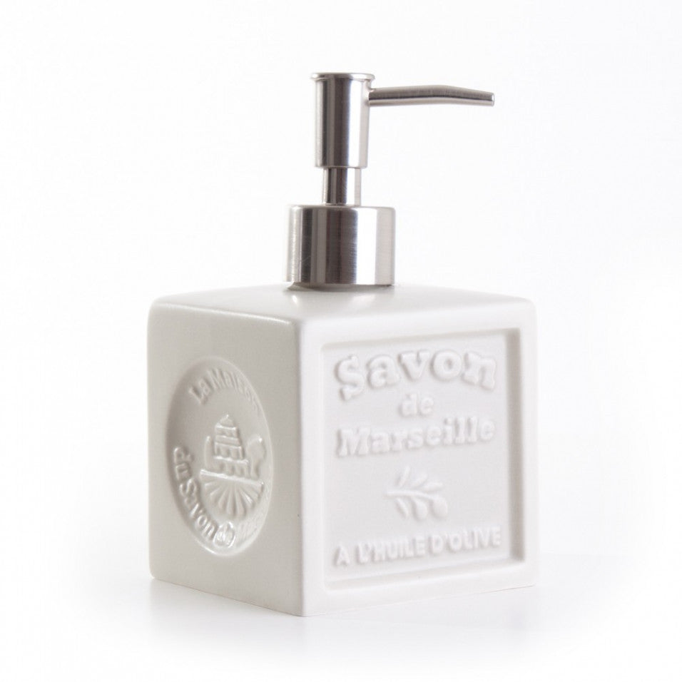A pretty ceramic dispenser with the iconic ivory Marseille soap cube design, accompanied by two refills of 1L donkey milk liquid soap, made in Provence. An ideal combo for an elegant, natural bathroom or sink.
