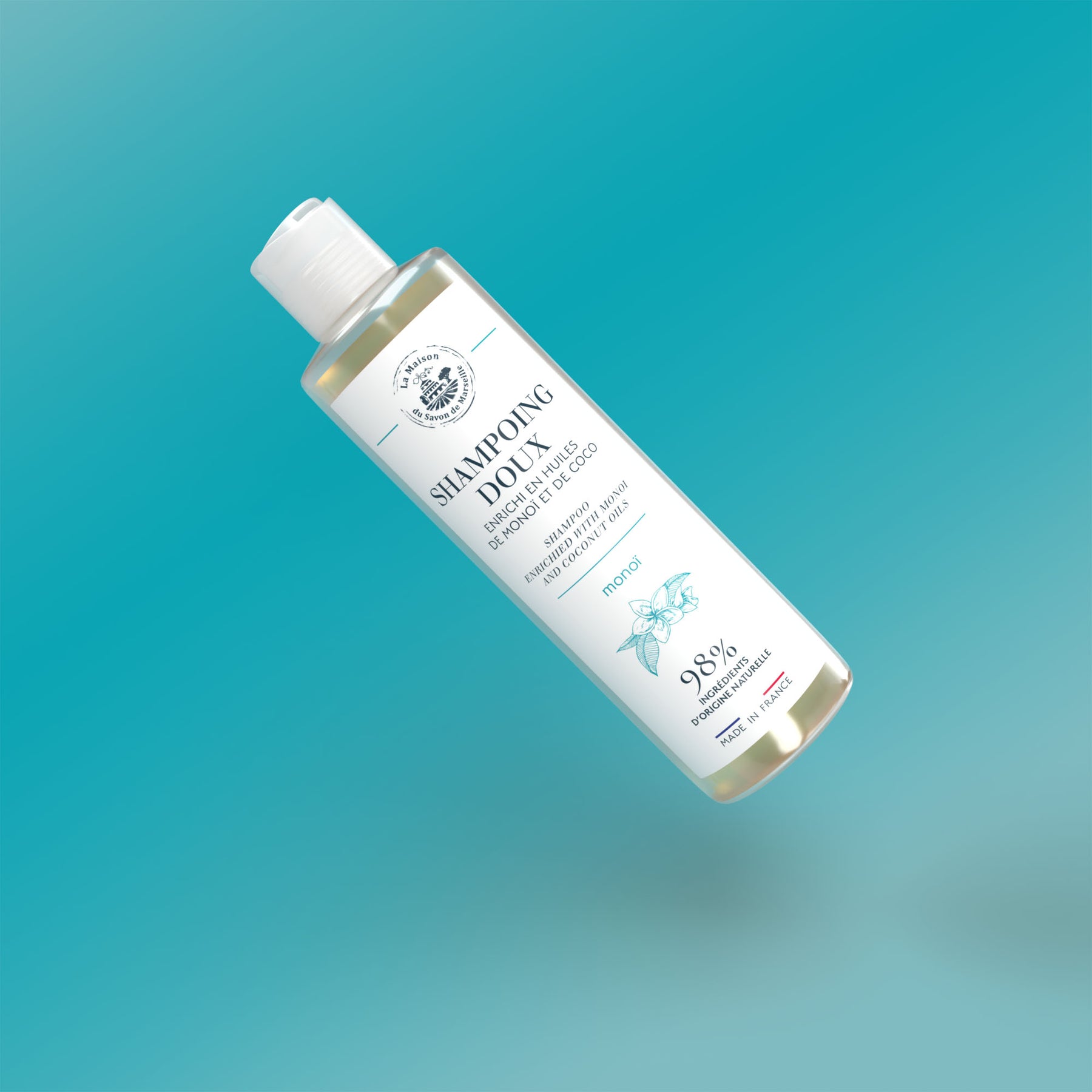 Nuestro champú líquido para cabellos normales está enriquecido con aceite de monoi y aceite de coco.